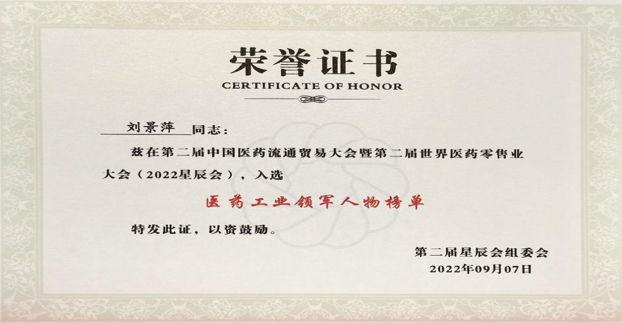 在本次开幕式上,发布了“医药工业领军人物”、“医药零售领军人物”榜单,JJB电竞药业集团刘景萍董事长凭借在儿药领域多年的努力探索和对行业的杰出贡献,荣获“医药工业领军人物”称号。