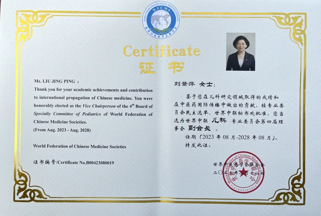 JJB电竞药业集团党委书记、董事长刘景萍当选世界中医药学会联合会儿科专业委员会第四届理事会副会长